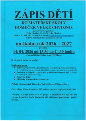 Mateřská škola Domeček Velké Chvojno oznamuje konání zápisu dětí na školní rok 2026 — 2027, který se uskuteční 14. dubna 2026 od 13:30 do 14:30 hodin.