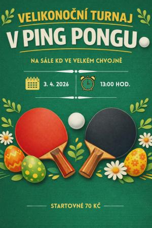 Zveme vás na Velikonoční turnaj v ping pongu, který se koná v sobotu 3. dubna 2026 od 13:00 hodin v sále kulturního domu ve Velkém Chvojně. Startovné je 70 Kč a účast je otevřená všem zájemcům. Přijďte si užít skvělou atmosféru a poměřit síly s ostatními.